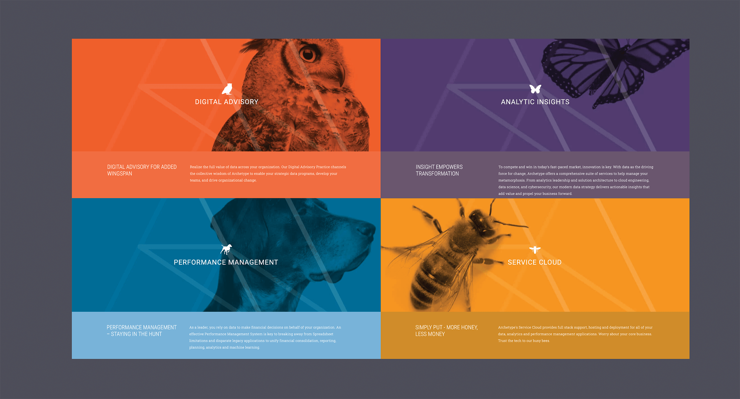 Archetype came to Interrobang with the goal of updating their brand to better communicate the caliber and breadth of services they provide, showcase the company as top tier in the industry, and effectively connect with their target audiences. Working with Archetype’s leadership and marketing teams, Interrobang developed an updated brand strategy which informed the creation of a new brand direction, including a sub-branding design system for the company’s core service areas. Interrobang supported Archetype in the rollout of the brand and provided training on the use of templates designed for in-house rollout. This work aligned the business and brand while setting Archetype up to stand out competitively and inspire client connection.